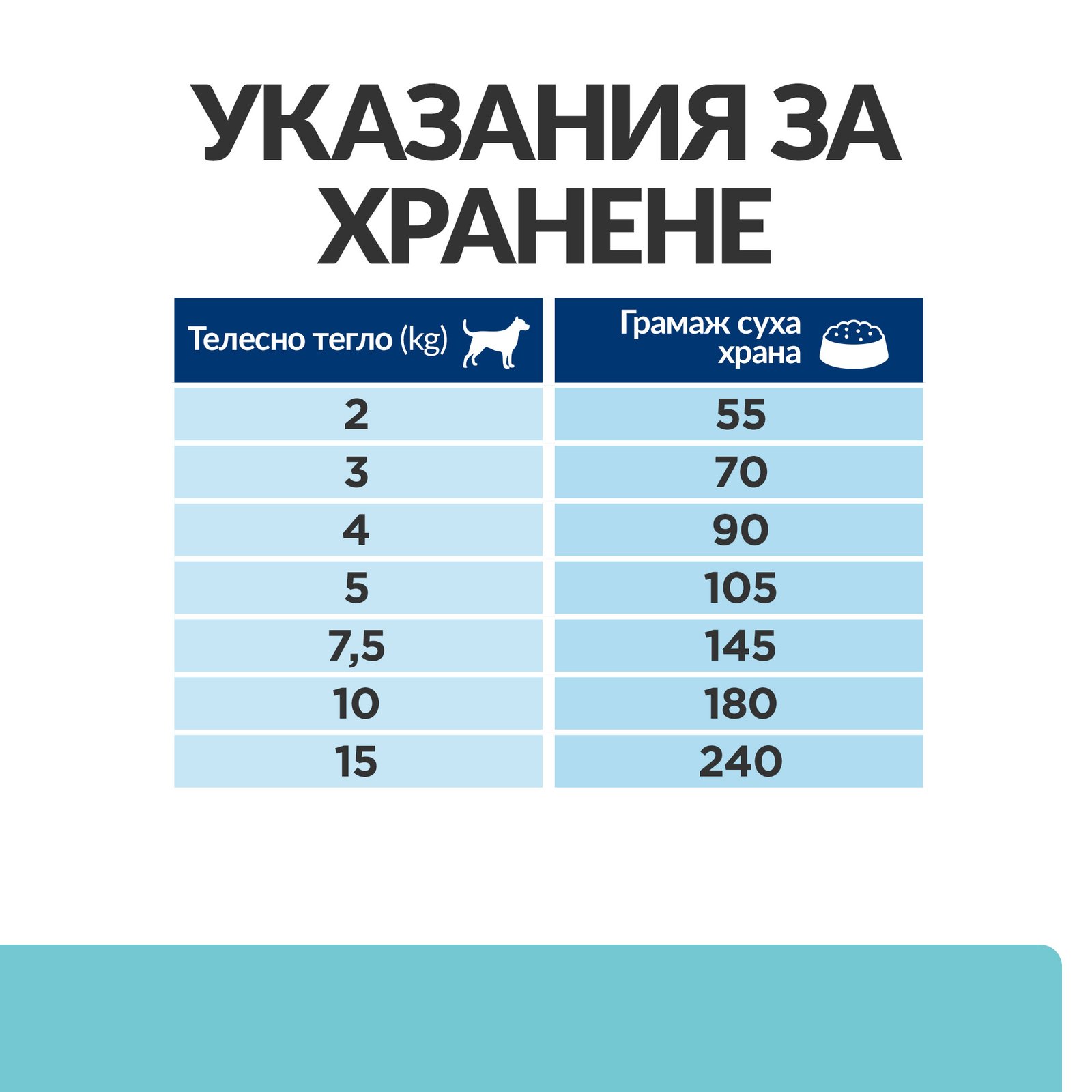 Давайте само препоръчаната храна PRESCRIPTION DIET. Преди употреба поискайте от ветеринарния лекар да ви даде конкретни указания за храненето на вашия домашен любимец. Вижте указанията за хранене на опаковката. Дневните препоръчителни дажби са само ориентировъчни. При съмнение се консултирайте с ветеринарен лекар. Винаги оставяйте прясна вода за пиене.
