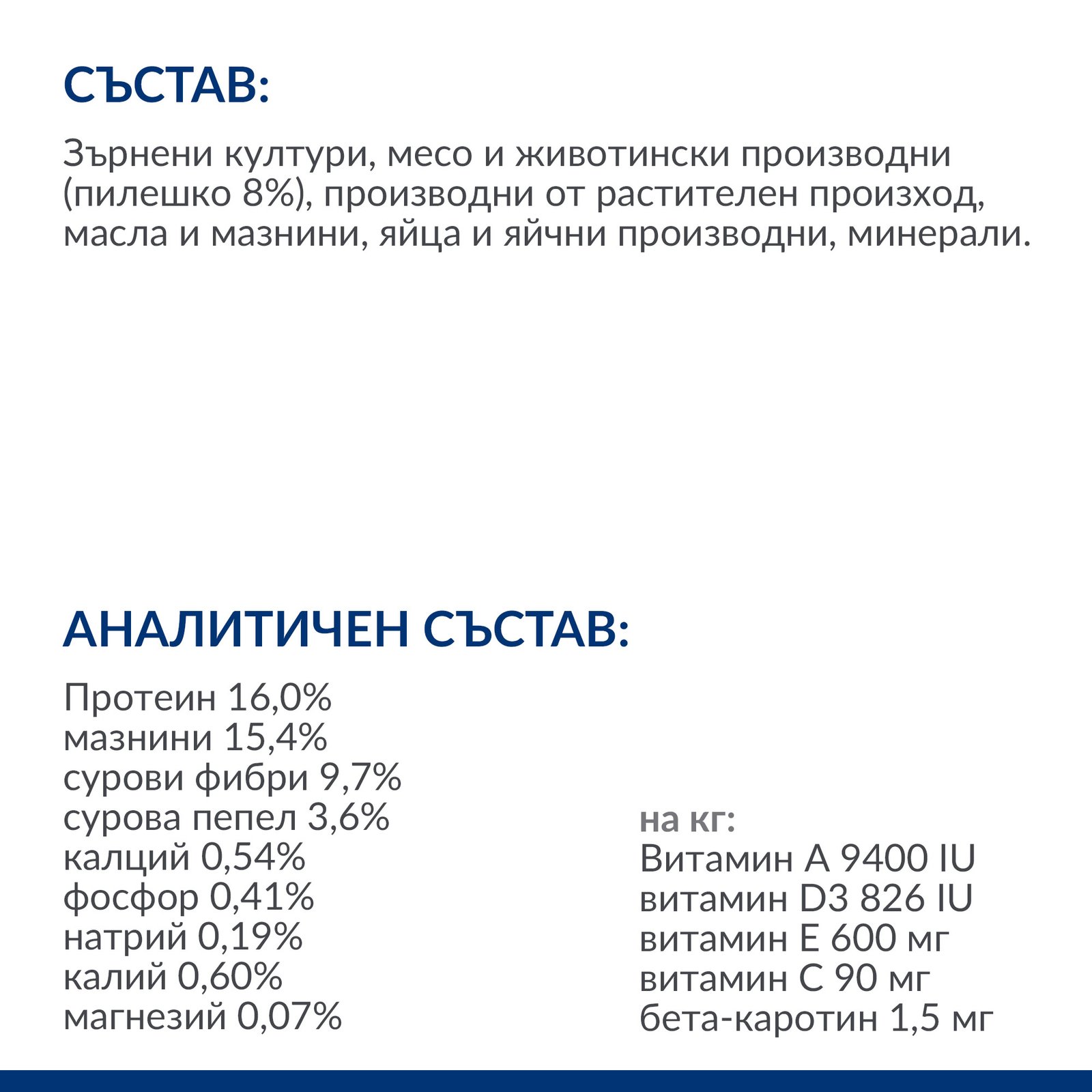 СЪСТАВ: Зърнени култури, месо и животински производни (пилешко 8%), производни от растителен произход, масла и мазнини, яйца и яйчни производни, минерали.