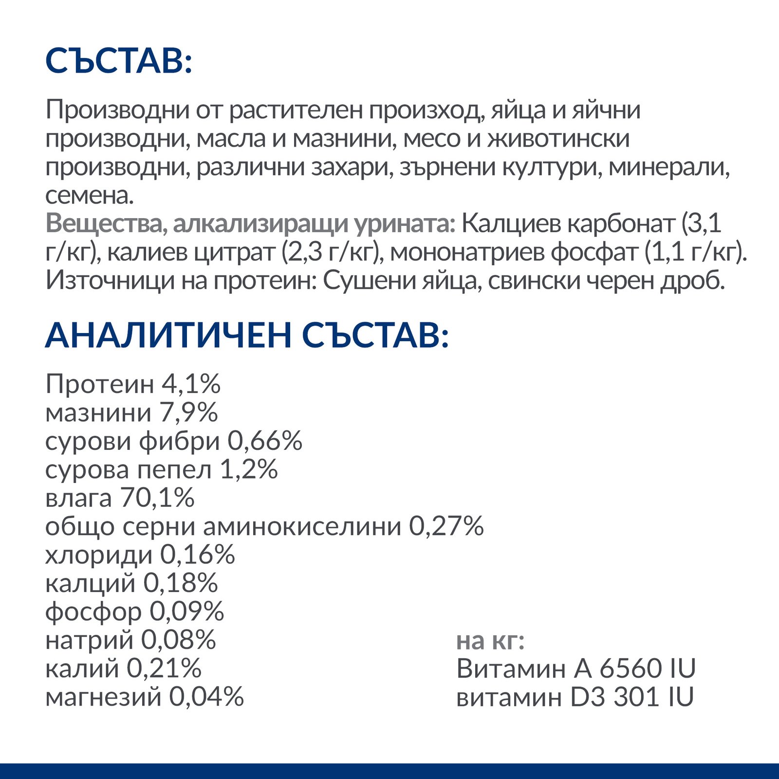 СЪСТАВ: Производни от растителен произход, яйца и яйчни производни, масла и мазнини, месо и животински производни, различни захари, зърнени култури, минерали, семена. Вещества, алкализиращи урината: Калциев карбонат (3,1 г/кг), калиев цитрат (2,3 г/кг), мононатриев фосфат (1,1 г/кг). Източници на протеин: Сушени яйца, свински черен дроб.