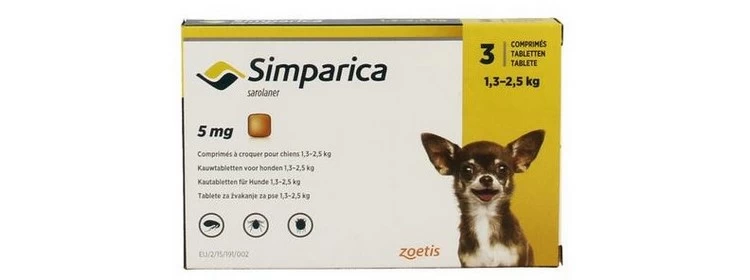Simparica 5mg – вкусни таблетки за кучета от 1.3кг до 2.5кг – за профилактика срещу външни паразити, 3 броя таблетки