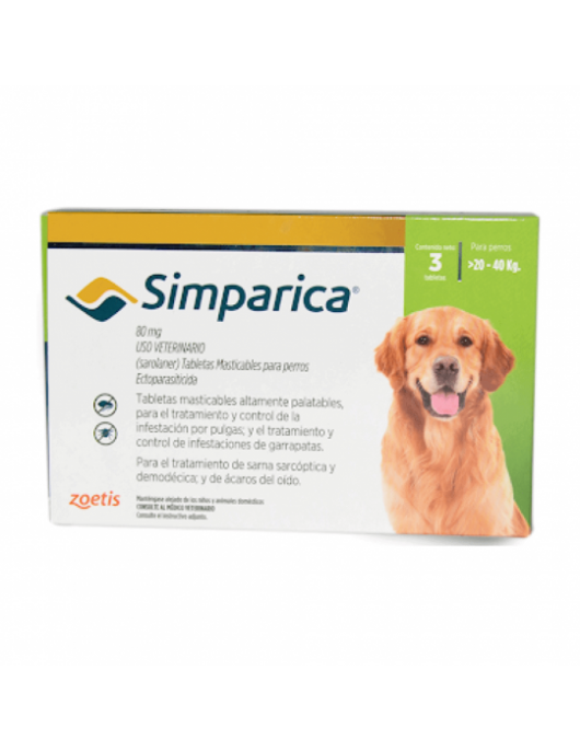 Simparica 80mg – вкусни таблетки за кучета от 20 до 40кг – за профилактика срещу външни паразити, 3 броя таблетки