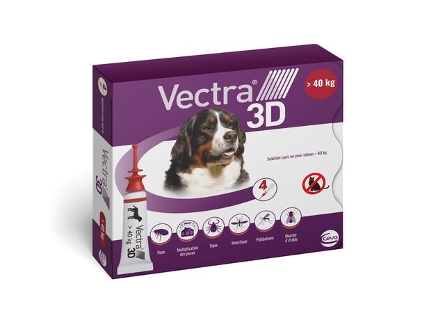 Vectra® 3D е наличен в 5 разфасовки според теглото, може да бъде използван при възрастни и при малки кучета на възраст от 7 седмици нагоре.