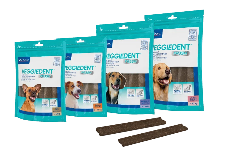 Проучванията показват, че 80% от кучетата развиват пародонтоза до тригодишна възраст*, така че грижата за устата на кучето ви е важна част от превантивния им здравен режим. Деветдесет процента от тестваните животни отбелязват подобрение с лошия дъх след употреба на дъвчащите ламели с 95% приятен дъх. VeggieDent ® FR3SH™ действа средно 3-5 минути и може да се дава ежедневно като част от контролирана и балансирана диета.