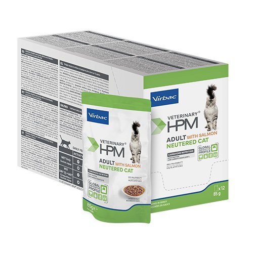 Virbac Veterinary HPM Adult Neutered – Salmon Chunks in gravy- хапки със съомга в сос грейви, за кастрирани котки над 12 месеца/кутия с 12 пауча x 85г.