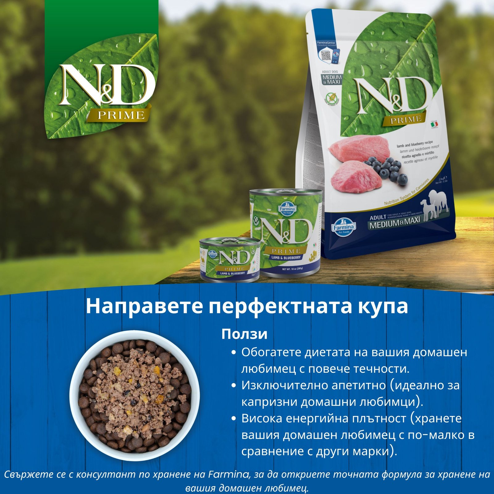 N&D Prime Lamb & Blueberry Adult Medium & Maxi – суха храна без зърнени култури за кучета над 1 година от средни и едри породи, с агнешко и боровинки