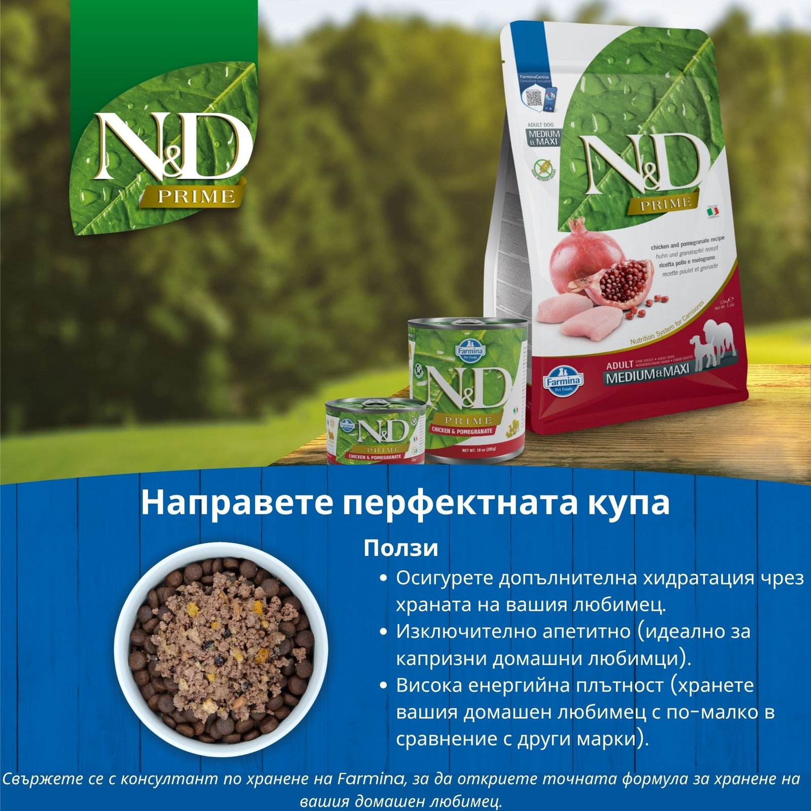 N&D Prime Chicken & Pomegranate Puppy Mini & Medium– суха храна без зърнени култури за подрастващи кученца от дребни и средни породи с пилешко и нар