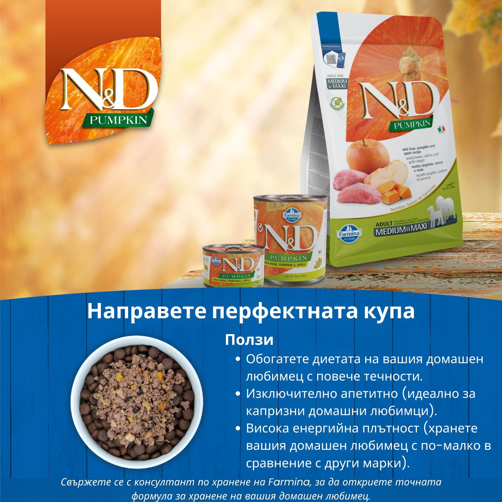N&D Pumpkin Boar & Apple Adult Medium & Maxi – суха храна без зърнени култури за кучета над 1 година от средни и едри породи, с глиганско, тиква и ябълка