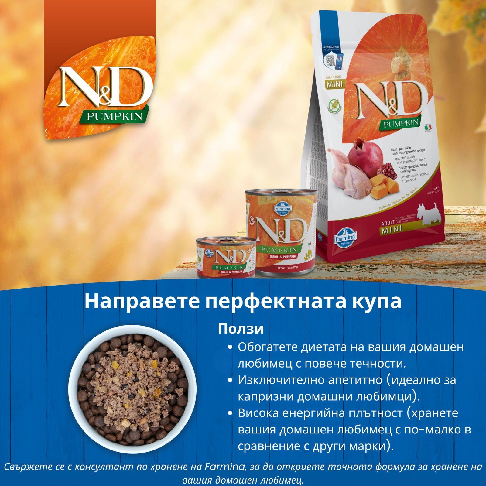 N&D Pumpkin & Quail Adult dog – пълноценна мокра храна без зърнени култури за кучета от всички породи в зряла възраст с пъдпъдък и тиква, консерва 285г.