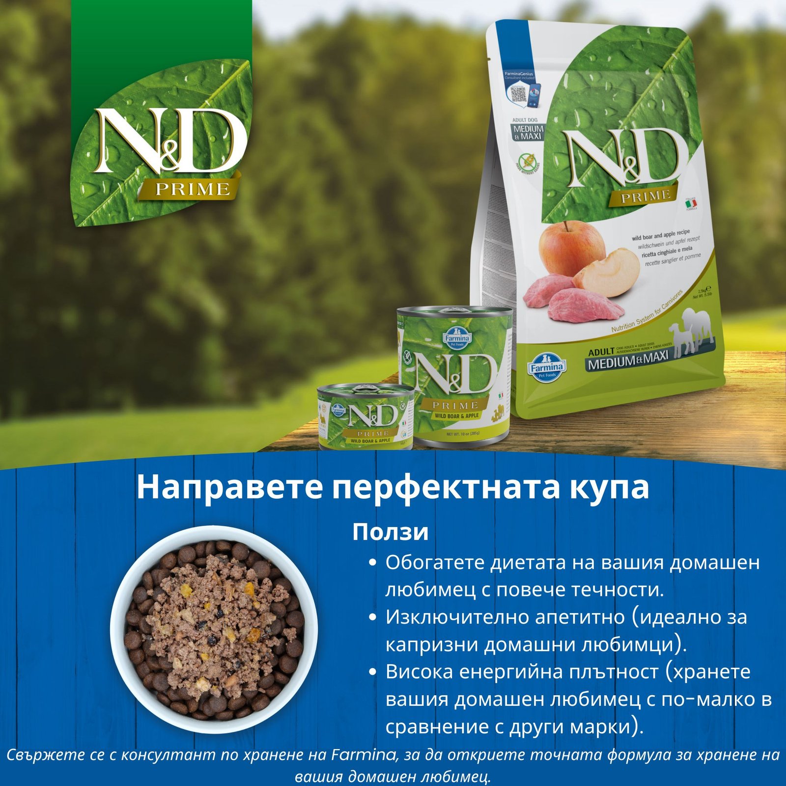N&D Prime Wild Boar & Apple Adult Medium & Maxi – суха храна без зърнени култури за кучета в зряла възраст от средни и едри породи, с глиган и ябълка