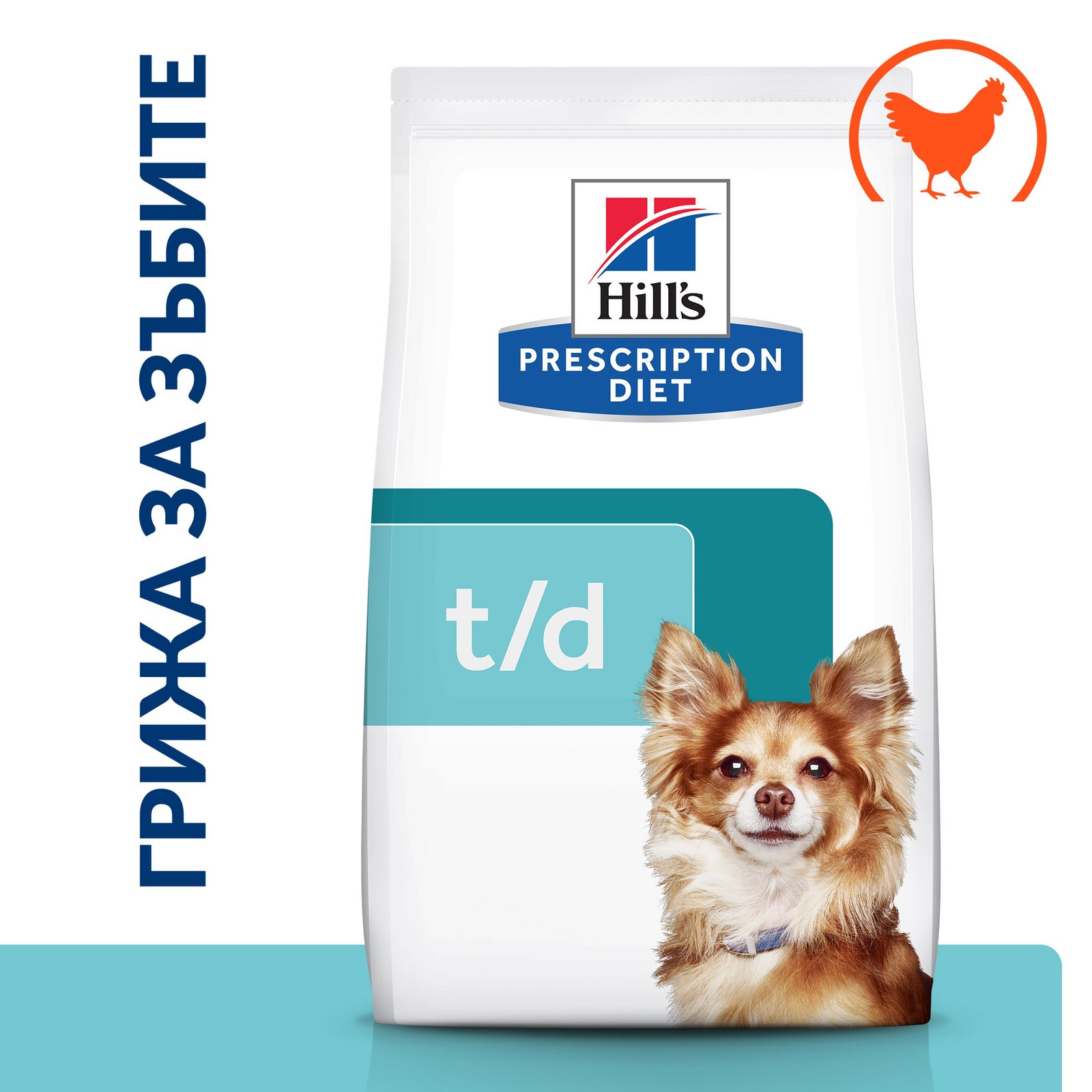 Hill’s PRESCRIPTION DIET t/d Mini Dental Care – лечебна суха храна за зъбна хигиена, намалява образуването на плака и зъбен камък – за кучета от дребни породи, с пилешко/ пакет 3кг.